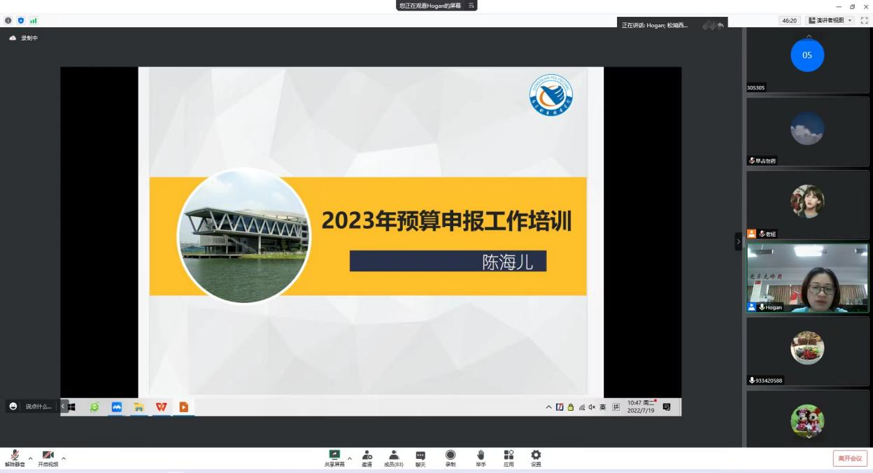 会议由计划财务处副处长陈海儿主持,会议主要包括:预算申报系统操作讲解、2023年预算申报注意事项讲解,以及现场提问答疑3个环节。